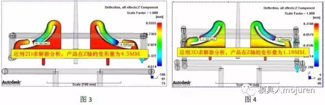 此產(chǎn)品用Moldflow 3D技術分析,也已經(jīng)做了反變形,但實際試模出的產(chǎn)品仍有較大的變形。