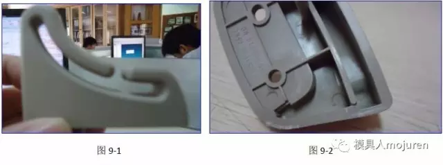 在這里制品仍做了1.2MM的反變形,澆口由原來的牛角進膠改為現(xiàn)在的大水口搭底進膠,分流道改為了S形,可防止主流道及分流道 的冷料進入模腔。實際的試模產(chǎn)品如圖9-1、9-2所示,產(chǎn)品無變形